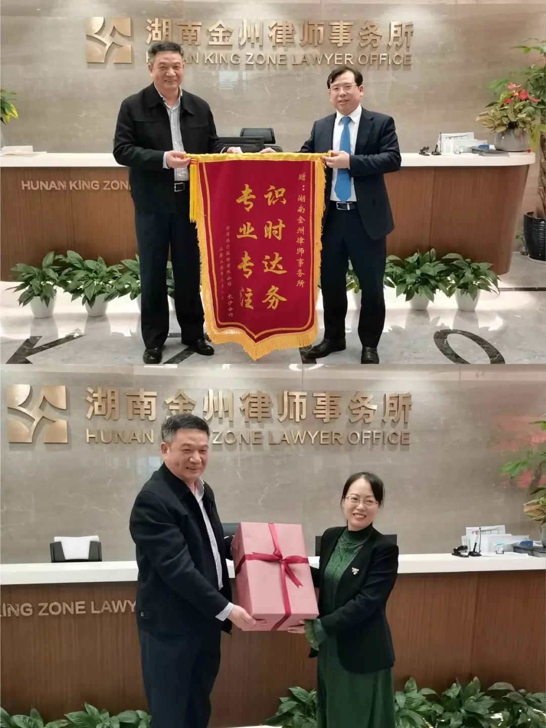 會后,姚自力書記向張才金主任贈送了“專業專注,適時達務”的錦旗,并向黎瑩律師贈送了禮品。