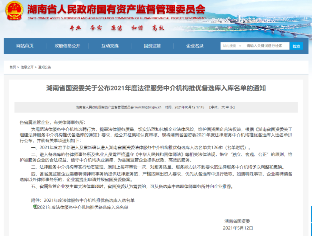 2021年5月12日,為規范法律服務中介機構選聘行為,提高法律服務質量,切實防范和化解企業法律風險,維護國資國企合法權益,湖南省國資委發布了《關于公布2021年度法律服務中介機構推優備選庫入庫名單的通知》。